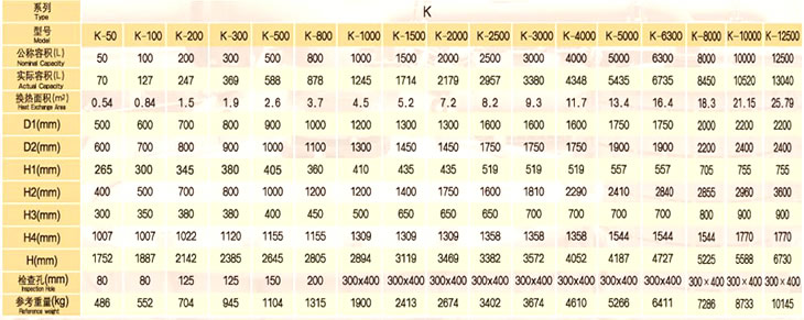 技术参数:1.设计压力 罐体=0.2MPa、 0.4MPa、0.6MPa、1.0MPa 夹套=0.6MPa2.搅拌器 具有多种型式的搅拌器供用户选择3.减速机 立式减速机4.轴 封 填料密封(0.2MPa) 单端面机械密封(0.4MPa} 双端面机械密封(0.6MPa、 1.0MPa)5.罐体设计压力超过0.6MPa的搪玻璃反应罐需特殊定货6.K型搪玻璃反应罐主体尺寸符合HG/T2371-92、GB/T 25027—2010标准,并在此基础上进行了改进。7.本设备符合搪玻璃设备技术条件:GB 25025—2010